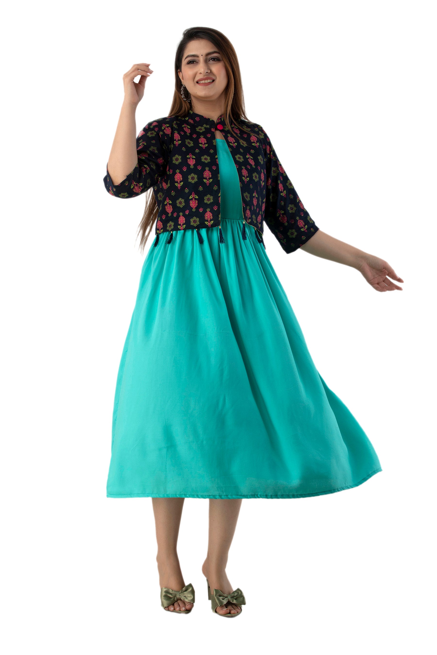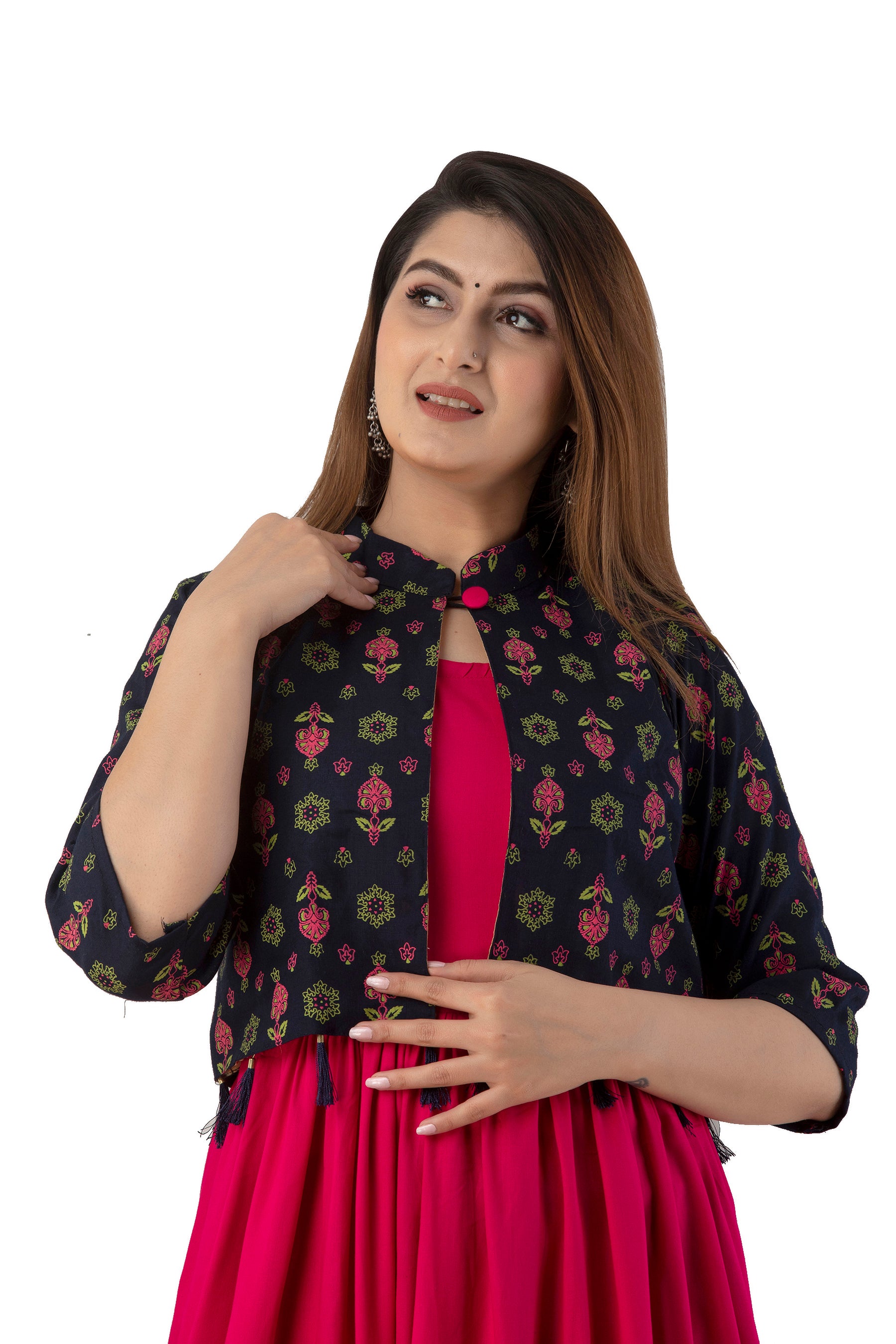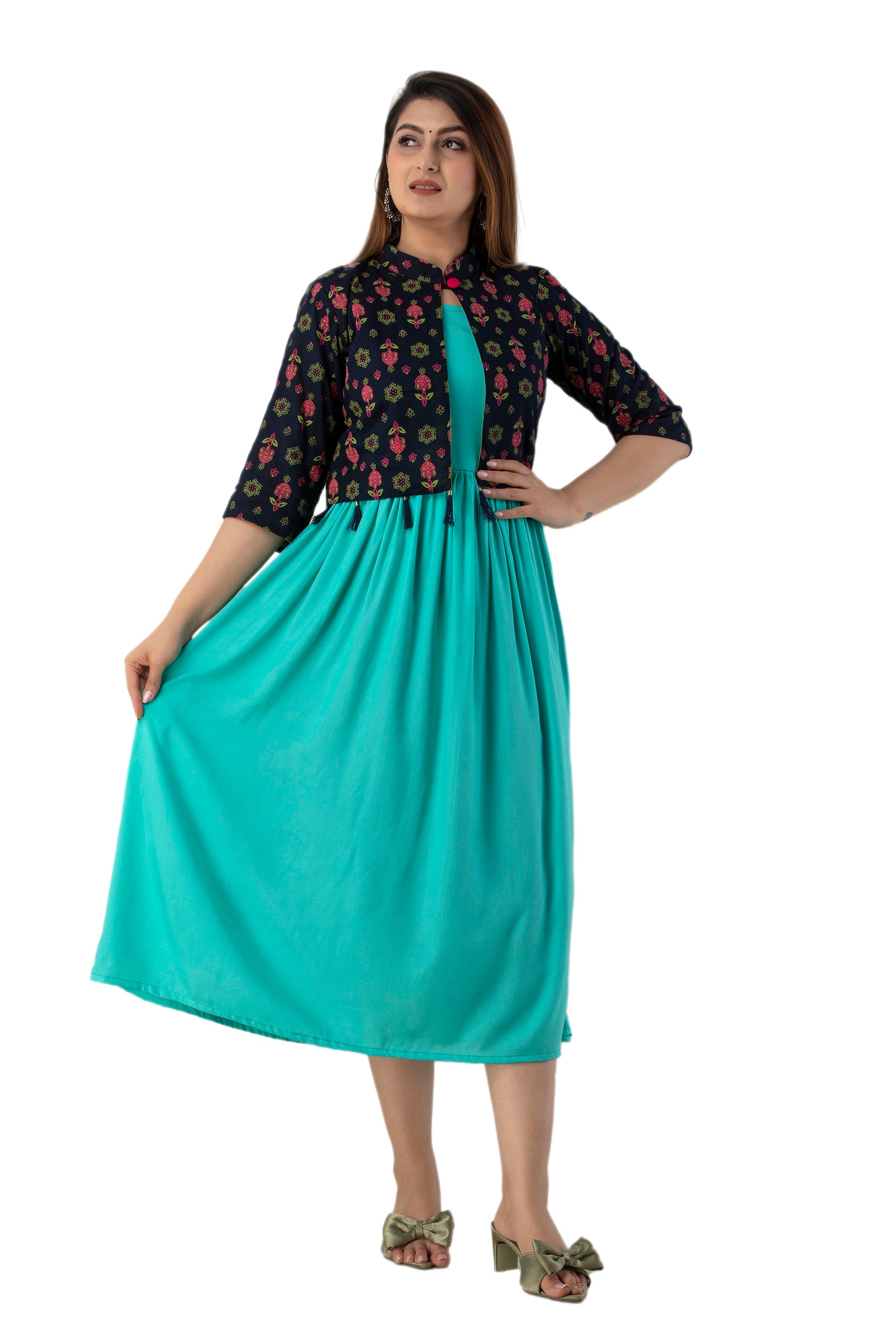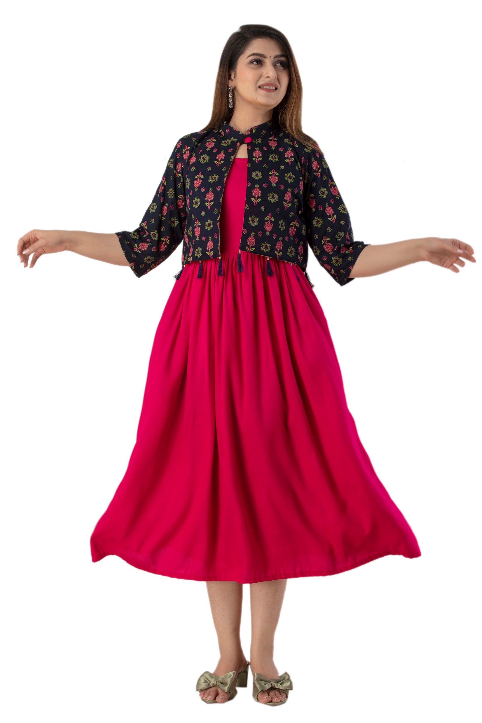 Rayon Sleeve Less Kurti With Printed Jacket