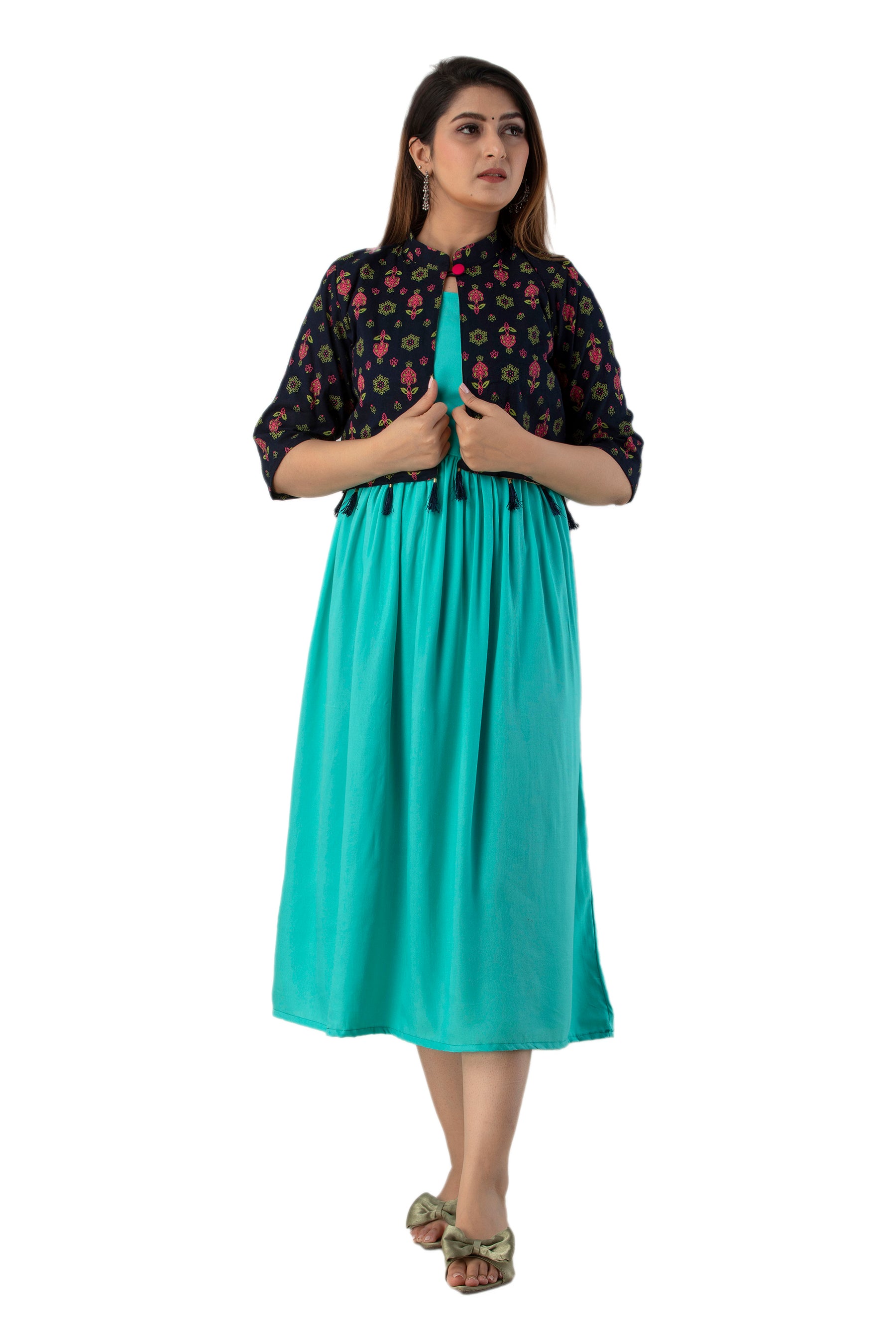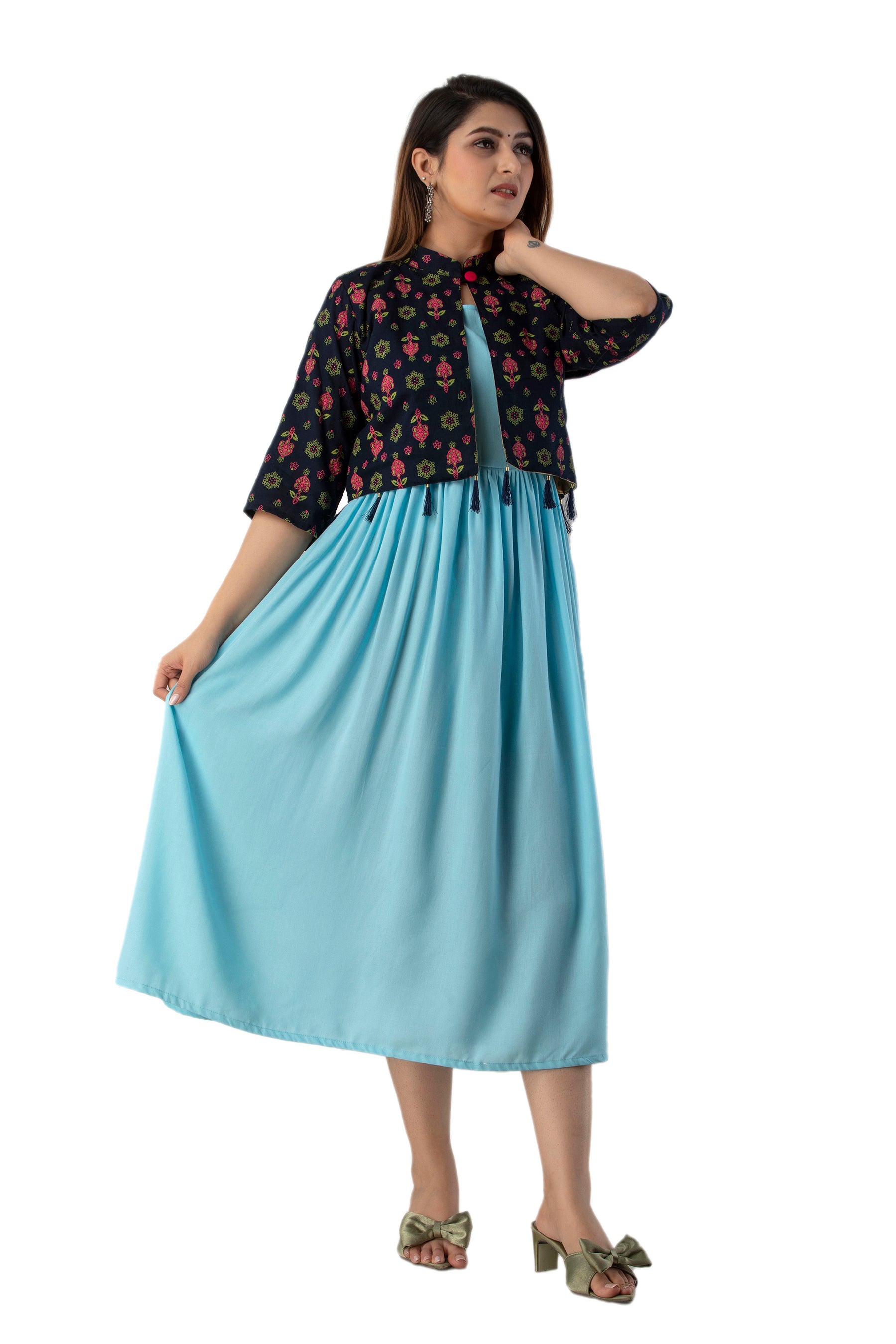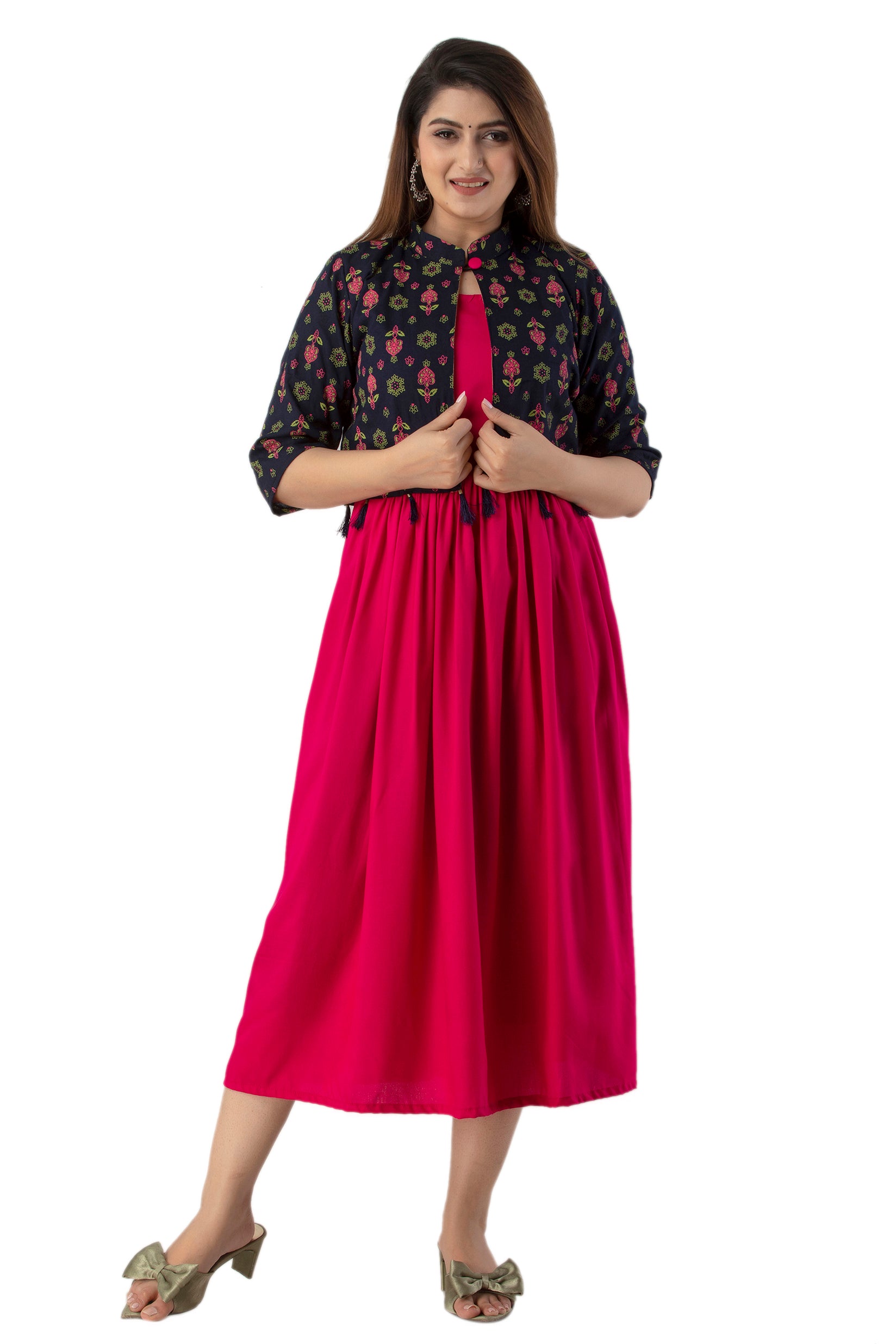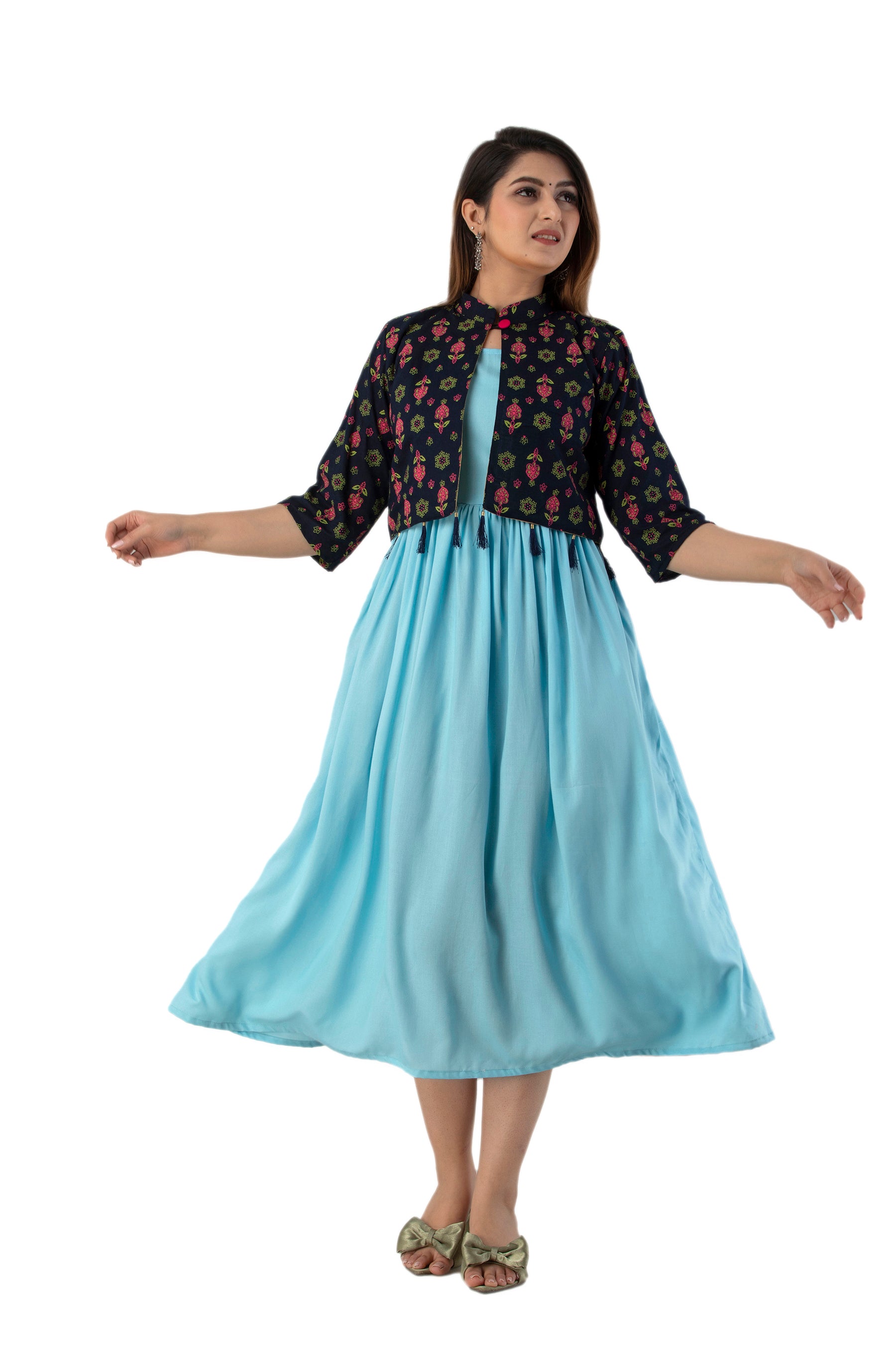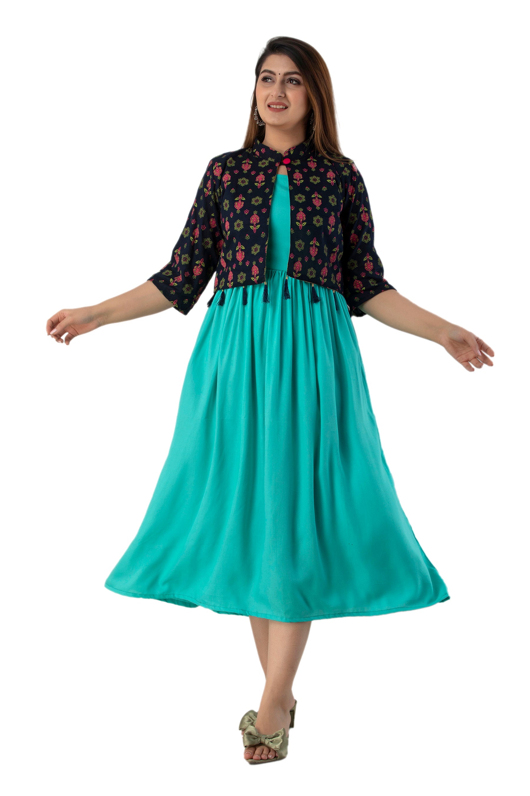 Rayon Sleeve Less Kurti With Printed Jacket